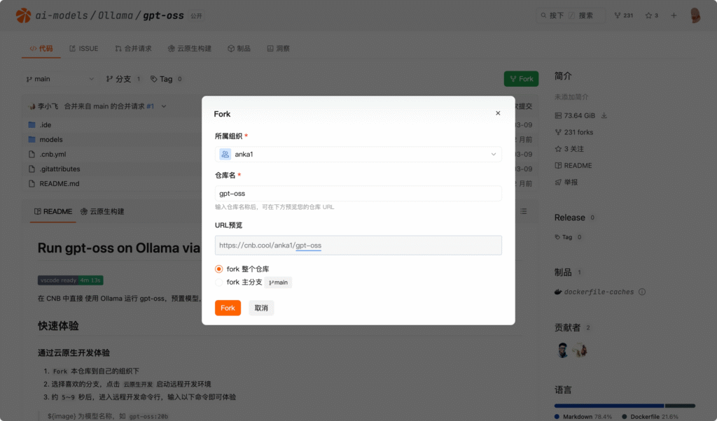 第一次 Fork 需要创建组织,按照引导创建即可,组织名字可以随便起(但不能违反法律及平台规则)