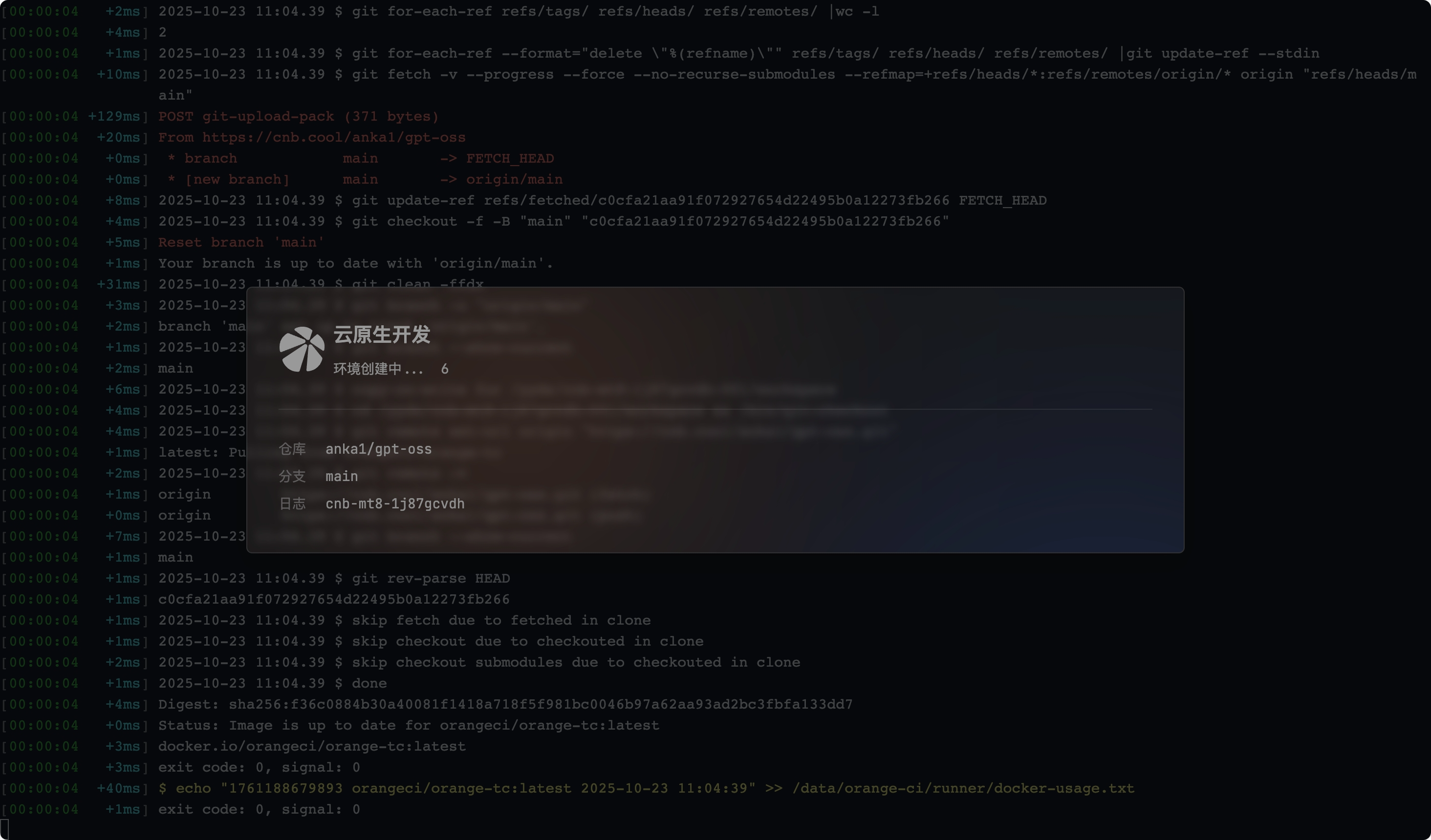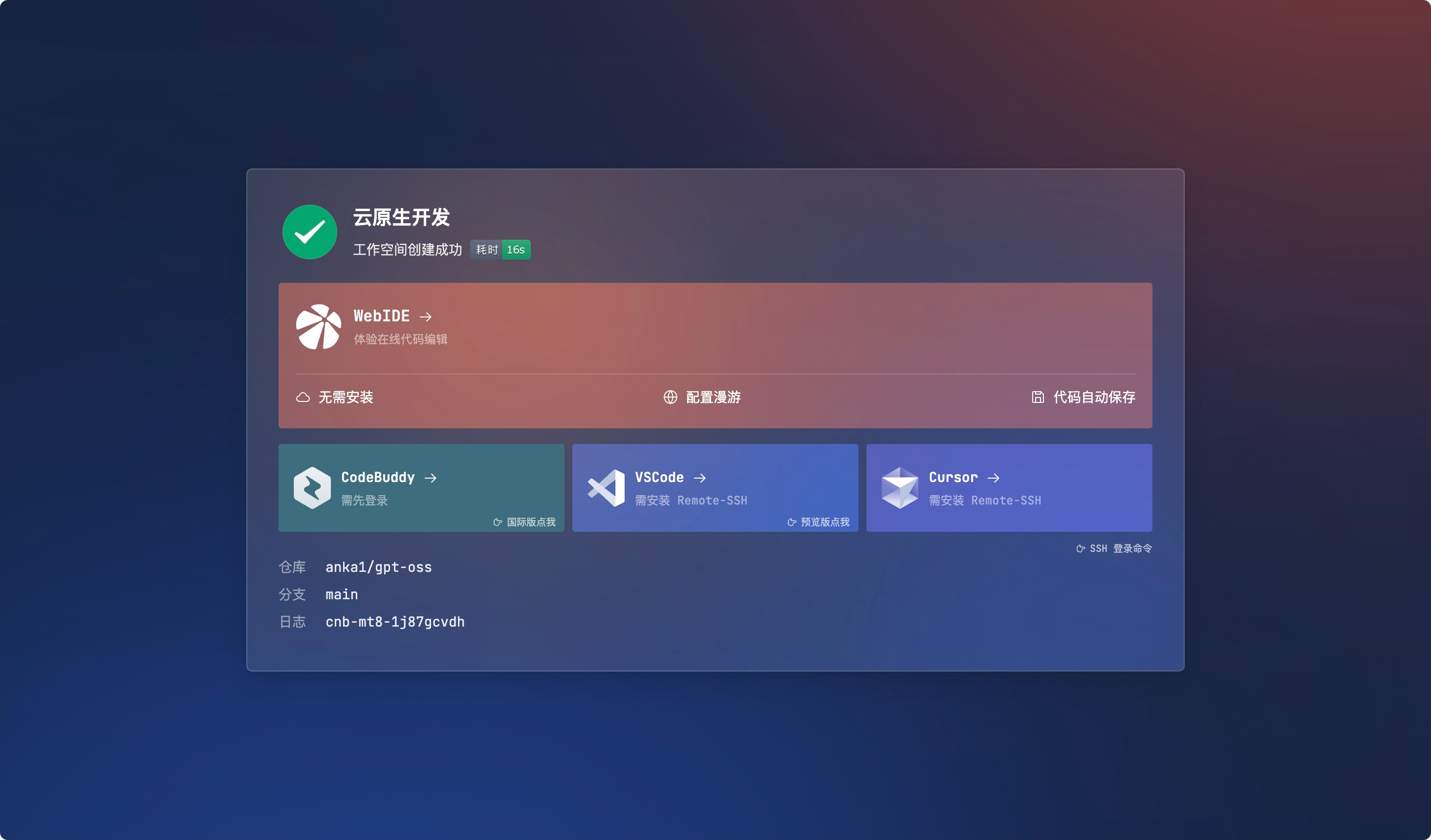现在,右上角多了一个橙色的 云原生开发 按钮,点击它即可 远橙开发,启动!