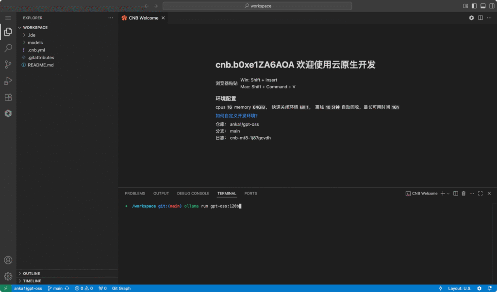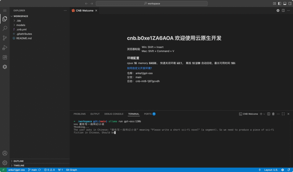 由于环境已经配置好了 ollama 以及 gpt-oss 模型,可以直接在下方的 TERMINAL 内输入启动命令: ollama run gpt-oss:20b 或 ollama run gpt-oss:120b (Tip:20b 和 120b 指的是模型量化程度,可以理解为,数字越大,模型越大,资源消耗越多,加载和推理所需时间也越长,但相对来说更聪明)